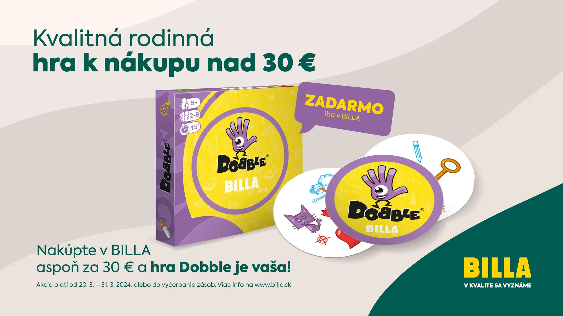 Obľúbenú stolnú rodinnú hru môžu celkom zdarma získať všetci zákazníci, ktorí v najbližšom období nakúpia v BILLA tovar v hodnote viac ako 30 eur. Akcia trvá v predajniach BILLA od 20. 3. do 31. 3. alebo do vypredania zásob. Po splnení najnižšej možnej peňažnej hodnoty nákupu, teda sumy 30 eur, získa hru Dobble každý zákazník – akcia nie je podmienená vlastníctvom BILLA Bonus karty ani inými faktormi.