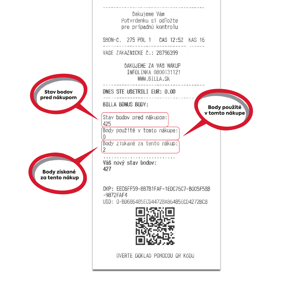 Na konci pokladničného bloku nájdete aj celkový stav bodov, teda body získané za nákup.