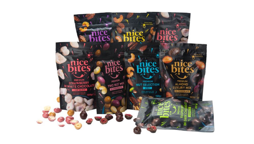 Prémiový rad produktov Nice Bites je skutočne celý na zjedenie. Od atraktívneho dizajnu obalov až po exkluzívny obsah plný rôznych chutí. V týchto luxusných balíčkoch nájdete orechy, orechové zmesi, spracované ovocie v čokoláde a taktiež aj orechy v čokoláde. Ak chcete potešiť nielen seba, ale aj druhých, tento rad orieškov je ideálny aj ako darček.