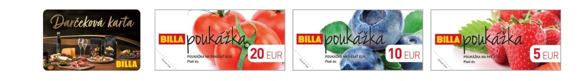 V predajniach BILLA je taktiež možné si zakúpiť a samozrejme aj uplatniť naše BILLA poukážky. A to vo forme papierových BILLA poukážok, ktoré ponúkame na nákup v hodnote: