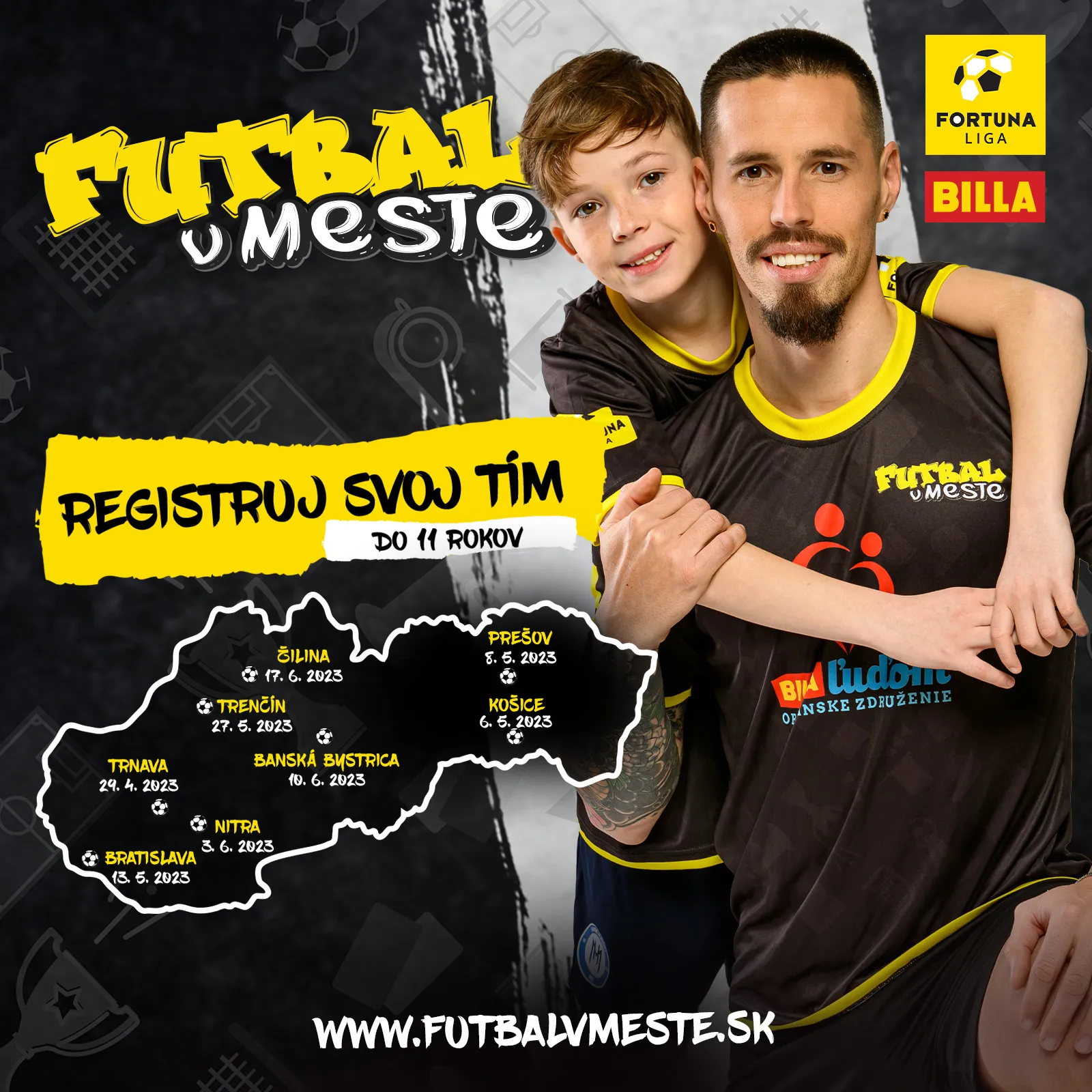 Futbal v meste nie je obyčajným futbalovým turnajom, je to výnimočný projekt pre mladé futbalové talenty do 11 rokov z celého Slovenska. Počas apríla – júna 2023 sa v ôsmich najväčších mestách na Slovensku rozohrajú semifinálové futbalové turnaje. Vždy mimo štadiónu, na námestiach či pri obchodných centrách. Skrátka, vždy tam, kde je prirodzene najviac ľudí. V auguste 2023 je potom naplánované veľkolepé finále v Bratislave pred Eurovea, do ktorého sa dostane 16 najlepších tímov do 11 rokov z celého Slovenska.