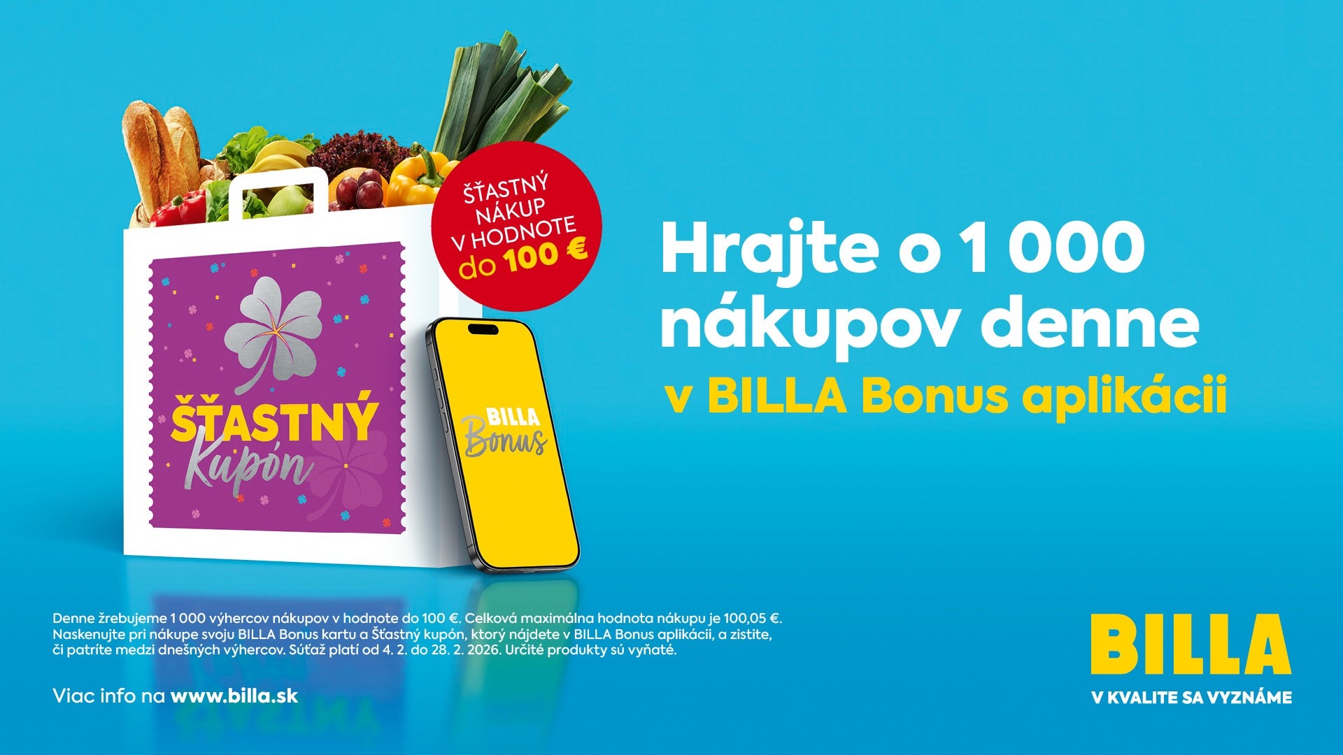 Súťaž Šťastný nákup v BILLA Bonus aplikácii prebieha do 28. februára 2026 a do hry sú každý deň systémom náhodne vybraní zákazníci a zákazníčky z databázy aplikácie. Podmienkou je mať aktivovaný online BILLA Bonus účet, pri nákupe použiť svoju BILLA Bonus kartu a naskenovať Šťastný kupón z aplikácie. Ak patríte medzi vyžrebované osoby a hodnota vášho nákupu nepresiahne 100 €, zaplatíte zaň len 5 centov. Ak váš nákup nie je ten šťastný, nič sa nedeje a nákup pokračuje bezo zmeny.