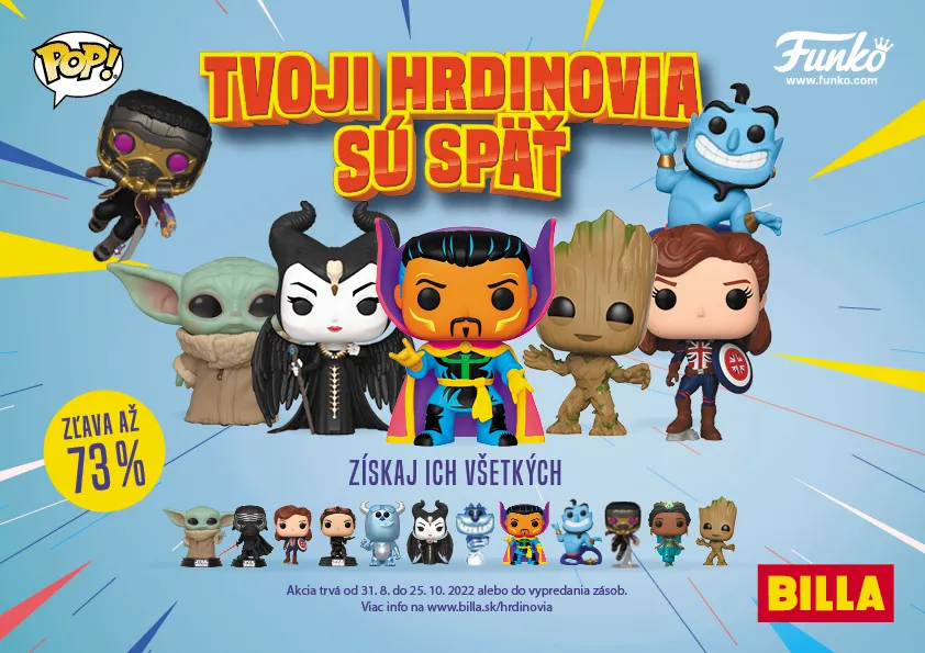Po úspechu vernostného programu „FUNKO Hrdinovia“, ktorý sieť supermarketov BILLA priniesla v roku 2020, sa postavičky FUNKO POP! s typicky veľkými a jedinečne zdobenými hlavičkami opäť vracajú do predajní. BILLA v rámci vernostnej kampane ponúka týchto figúrok dovedna 12, pričom ide o postavy zo ságy Hviezdne vojny, tiež o Marvel superhrdinov ako Dr. Strange, Groot a Captain Carter, ale aj o charaktery z rozprávok Disney. Počas trvania vernostného programu si zákazníci môžu FUNKO POP! postavičky zakúpiť so zľavou až do výšky 73 %.