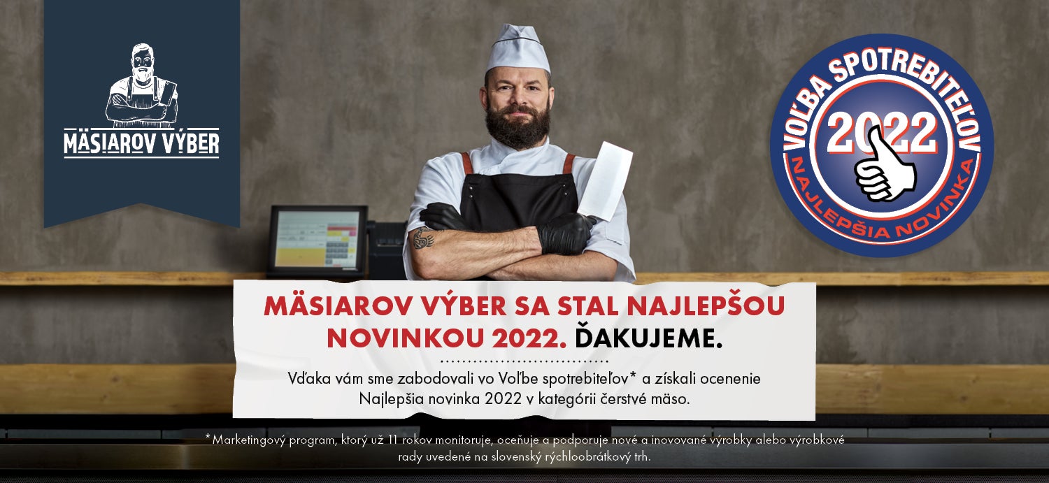 „Voľba spotrebiteľov – Najlepšia novinka“ je spotrebiteľské ocenenie, ktoré sa uskutočnilo už po jedenástykrát. Stojí za ním spoločnosť Atoz Marketing Services, ktorá sa už od roku 1993 zaoberá business to business komunikáciou v oblasti retailu, logistiky, obalového priemyslu, farmácie a segmentu HoReCa. Cieľom ocenenia je vyzdvihnúť nové a inovované výrobky na trhu a uľahčiť zákazníkom orientáciu medzi produktmi. V aktuálnom ročníku súťažilo 125 noviniek, pričom rozdelené boli do 40 kategórií. O víťazoch rozhodlo 2000 slovenských spotrebiteľov, ktorí sa zúčastnili na prieskume agentúry NielsenIQ. Okrem kategórie Čerstvé mäso bola privátna značka Mäsiarov výber úspešná aj v doprovodnom online hlasovaní, v ktorom o víťazoch hlasovali čitatelia portálov mediálnych partnerov súťaže. Za Najlepšiu novinku 2022 si Mäsiarov výber zvolili čitatelia webového portálu Teraz.sk. „Aj vďaka oceneniu Voľba spotrebiteľov – Najlepšia novinka 2022 môžeme prirodzene a efektívne šíriť naše dobré meno. Fakt, že zákazníci vyzdvihli spomedzi konkurencie práve našu privátnu značku Mäsiarov výber, je veľmi pozitívnym impulzom pre ďalších ľudí, ktorí s týmto kvalitným mäsom možno ešte nemajú skúsenosť. Na zisk ocenenia sme veľmi hrdí a otvára sa nám vďaka nemu nový komunikačný priestor,“ povedala A. Georgieva.