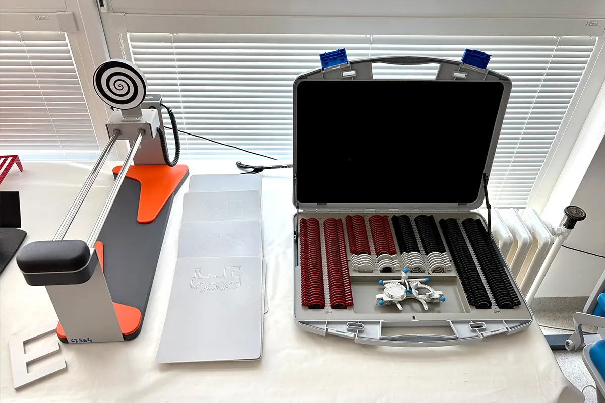 Neodmysliteľnou súčasťou pri vyšetrení refrakčných chýb je aj sada skúšobných šošoviek v kufríku. Používajú na testovanie zraku a stanovenie správneho predpisu na okuliare alebo kontaktné šošovky. Šošovky sa vkladajú do skúšobného rámu a lekár postupne vyberá šošovky, ktoré poskytujú najostrejší obraz. Sú kľúčové pre správne nastavenie a vyšetrenie zrakových problémov detí. Pomáhajú lekárovi určiť, ktorá optická korekcia je najlepšia pre konkrétne dieťa, čo je dôležité pre jeho každodenný život a rozvoj.