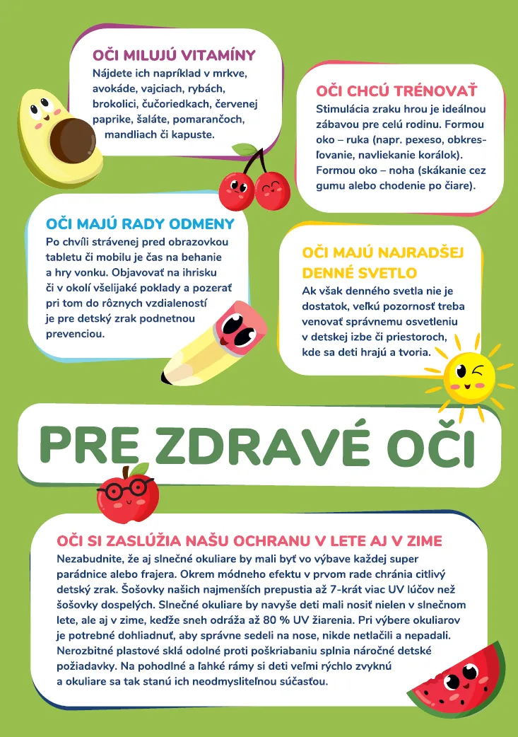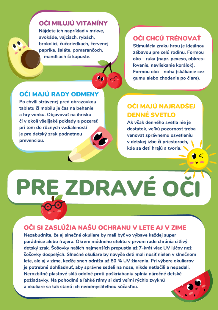 Do šiestich rokov nevedia naši najmenší sami vyhodnotiť, či ich oči fungujú tak, ako by mali. Rovnako ani najstarostlivejší rodič voľným okom nemusí zachytiť začínajúce sa problémy. Preto sa program „Zdravé oči už v škôlke“ zameriava práve na skupinu predškolákov. „Prevencia a starostlivosť o zrak má obrovský význam aj z dôvodu, že až 80 % všetkých vnemov zachytávame práve očami. Do šiestich rokov veku dieťaťa je možné odhaliť začínajúce sa očné poruchy a ochorenia. Rodičia sami veľmi často nevedia identifikovať prvé prejavy zrakových problémov. Dieťa nevyhodnotí, že niečo nie je v poriadku a skutočný stav sa následne prejaví až nástupom do školy, kde je na zrak dieťaťa kladená väčšia záťaž. Vtedy už ale môže byť na naštartovanie efektívnej liečby a korekcie neskoro,“ konštatuje MUDr. Beáta Bušányová, PhD., primárka Kliniky detskej oftalmológie LF UK a Národného ústavu detských chorôb v Bratislave.