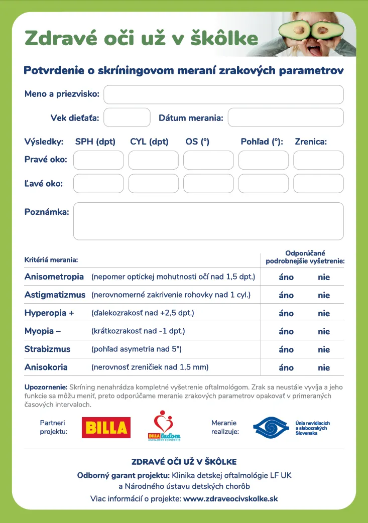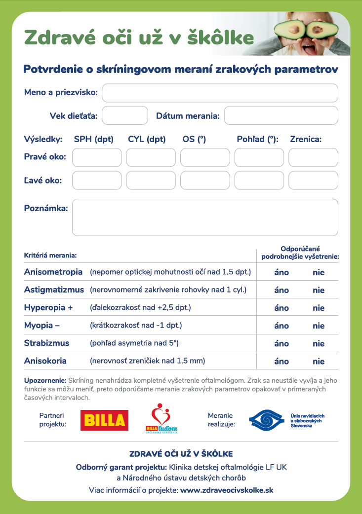 U detí v predškolskom veku je zachytenie zrakovej odchýlky laickým okom rodiča prakticky nemožné. Cieľom preventívneho programu „Zdravé oči už v škôlke“, financovaného z prostriedkov o. z. BILLA ľuďom, je preto prevencia a včasná diagnostika prípadných odchýlok a ochorení vo veku, keď je jednotlivé poruchy ešte možné podchytiť či úplne zvrátiť. Za päť rokov sa Únii nevidiacich a slabozrakých Slovenska (ÚNSS) spolu so spoločnosťou BILLA a jej o. z. BILLA ľuďom podarilo skontrolovať zrak takmer 86 000 deťom po celom Slovensku. Úspešný preventívny program už zajtra spustí svoj 6. ročník, do ktorého sa materské školy môžu zaregistrovať a absolvovať skríningové meranie.