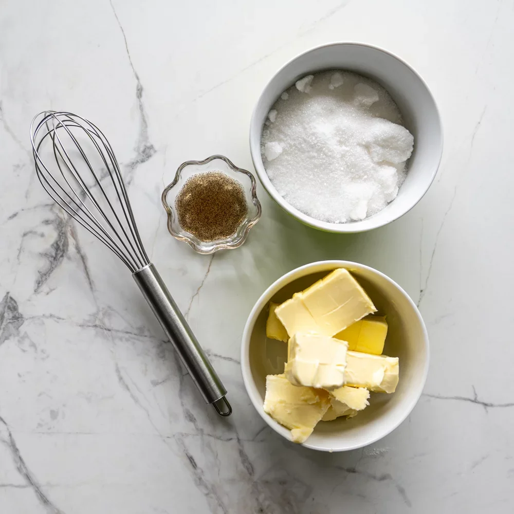 - Krok 2Vo väčšej mise vyšľaháme maslo, cukor a vanilku. Šľaháme dostatočne dlho, asi tak 5 minút, pokiaľ nie je hmota pekne nadýchaná.
