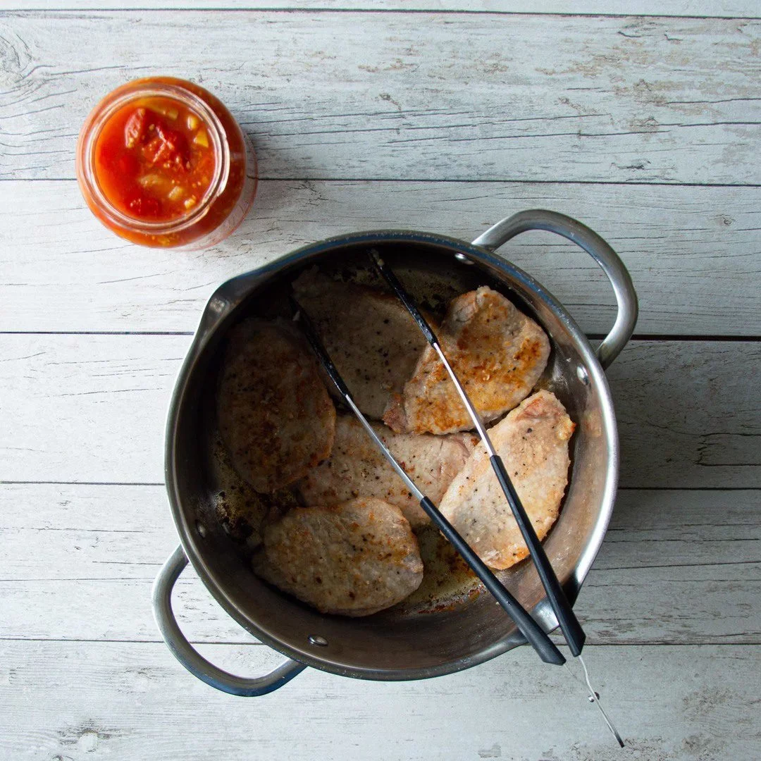 Mäso dusíme zhruba 5 minút a potom k nemu prilejeme lečo z pohára. Ak nemáme hotové lečo, samozrejme môžeme použiť pokrájané čerstvé paradajky a papriky. Výborný nápad je použiť aj doma zavárané lečo, ktoré má obvykle veľa šťavy a na prípravu klasického leča s vajíčkami sa vlastne až tak nehodí 🙂