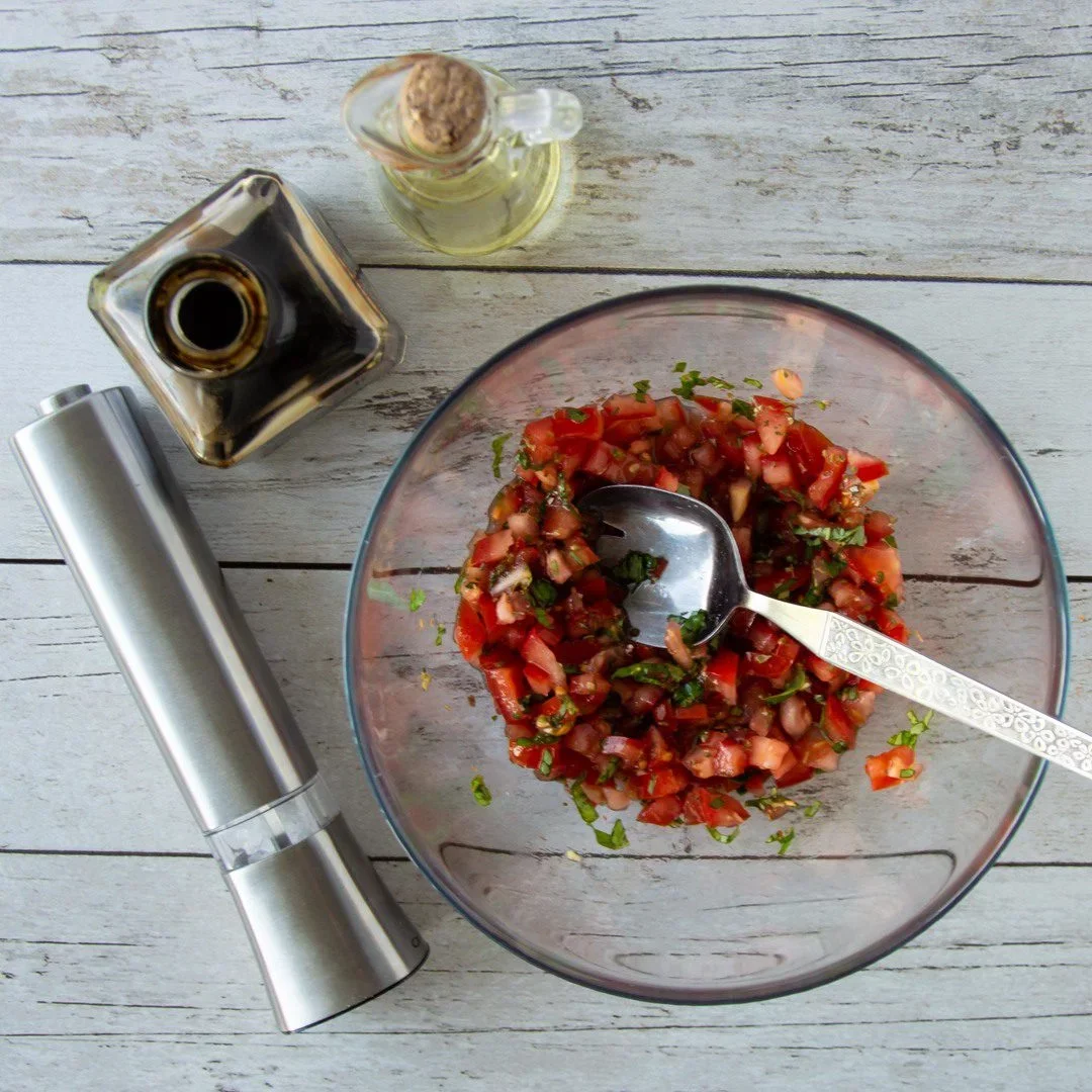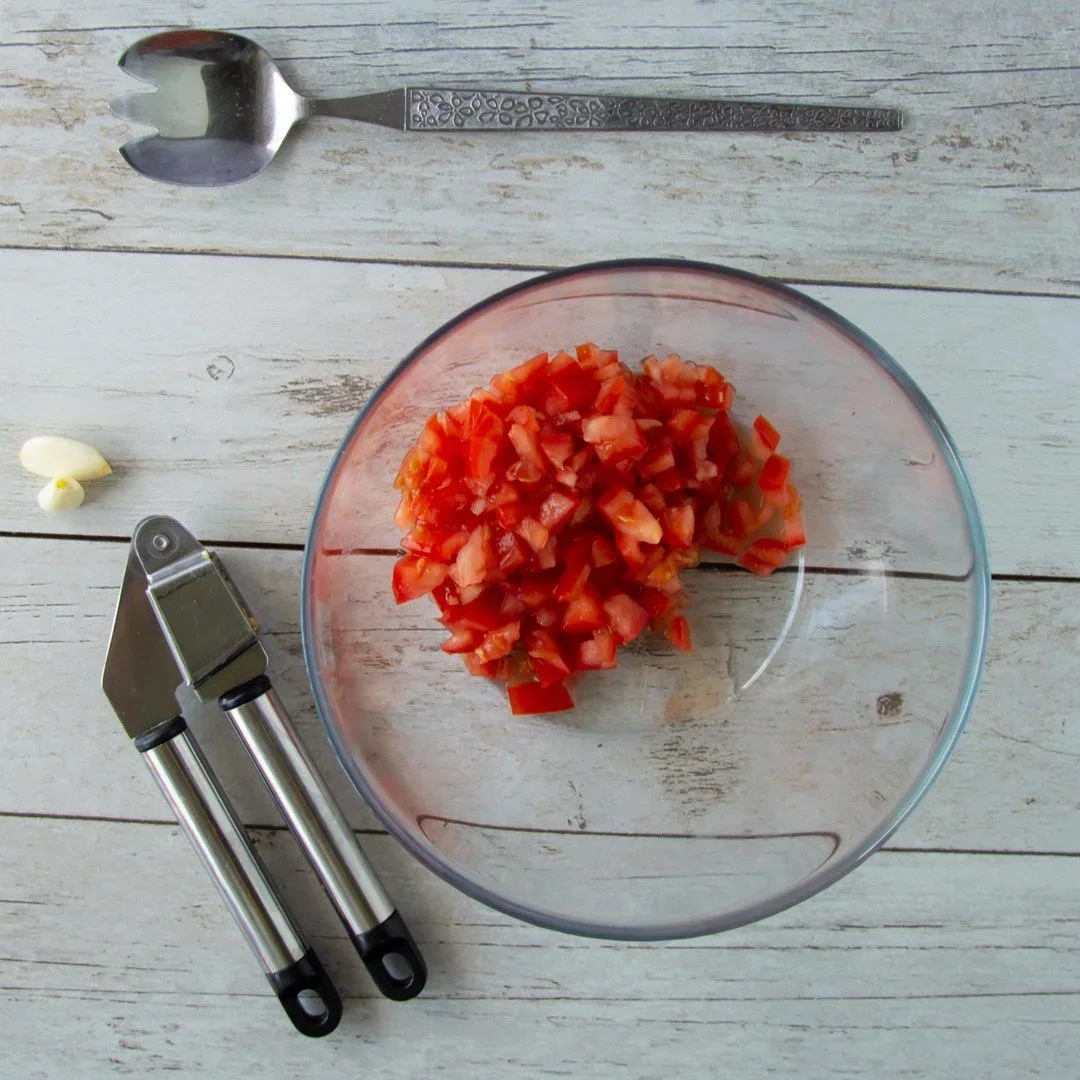 - 4väčšie zrelé paradajky, alebo 2 hrste farebných cherry paradajok