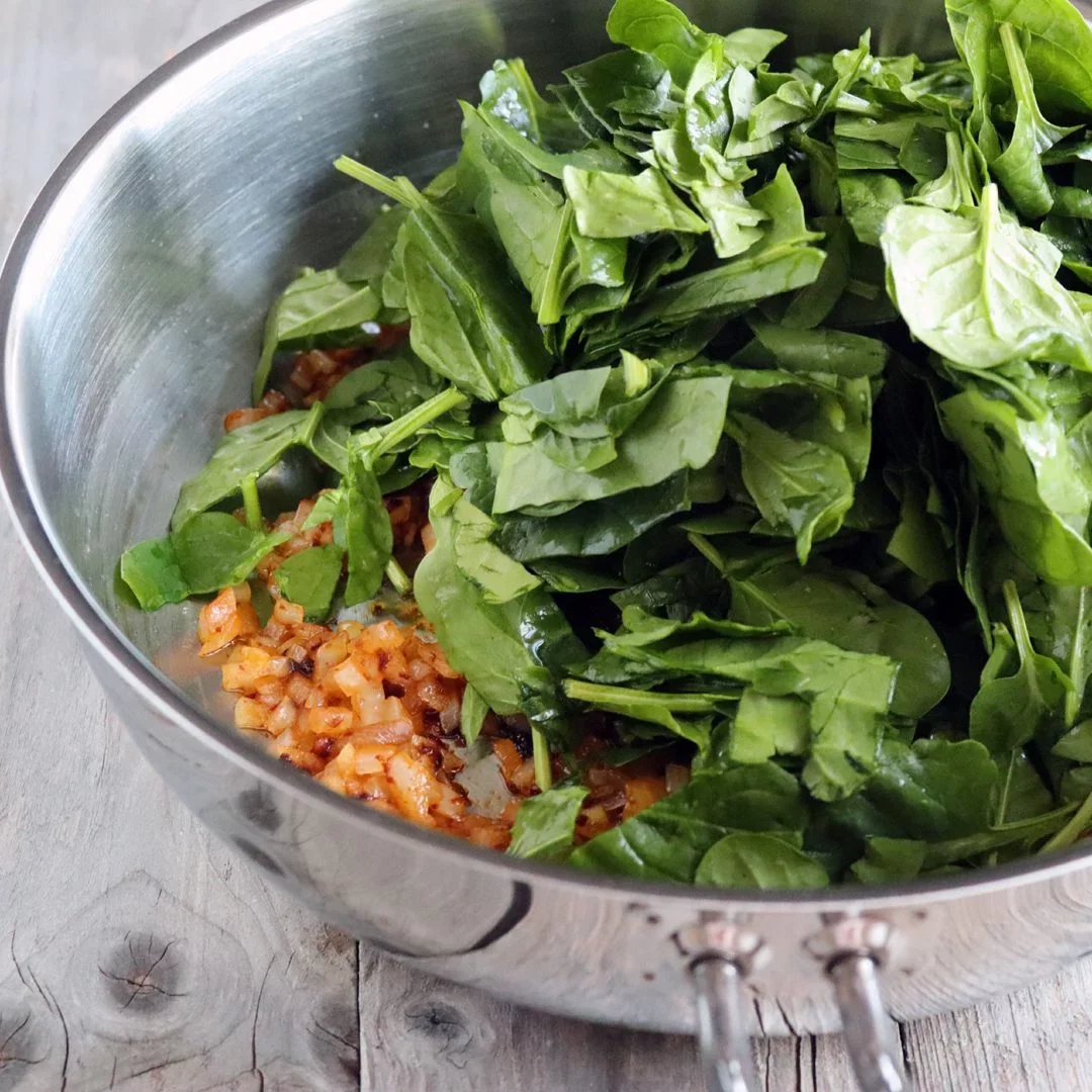 Vo väčšej panvici zohrejeme olej, pridáme najemno nasekanú cibuľu a opekáme do sklovita. Pridáme necelú lyžičku sladkej mletej papriky, premiešame a hneď do panvice vložíme špenát. Obsah panvice premiešame, špenát zavädne a pustí šťavu. Osolíme a okoreníme. Dusíme dovtedy, kým sa všetka tekutina neodparí, bude to trvať pár minút. Nakoniec ochutíme šťavou z citróna.