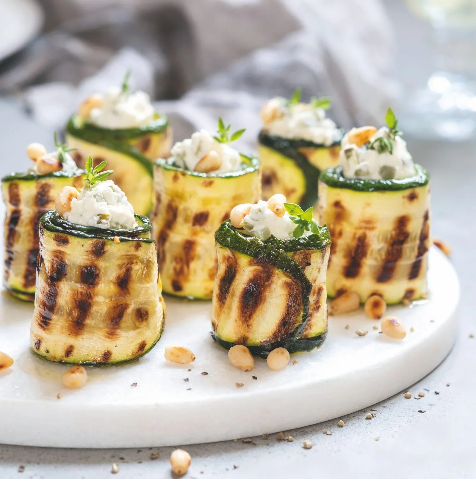 Syrovú náplň rozotrite na grilovanú cuketu, zrolujte ju a posypte opečenými píniovými orieškami a zvyšnými lístkami tymianu.