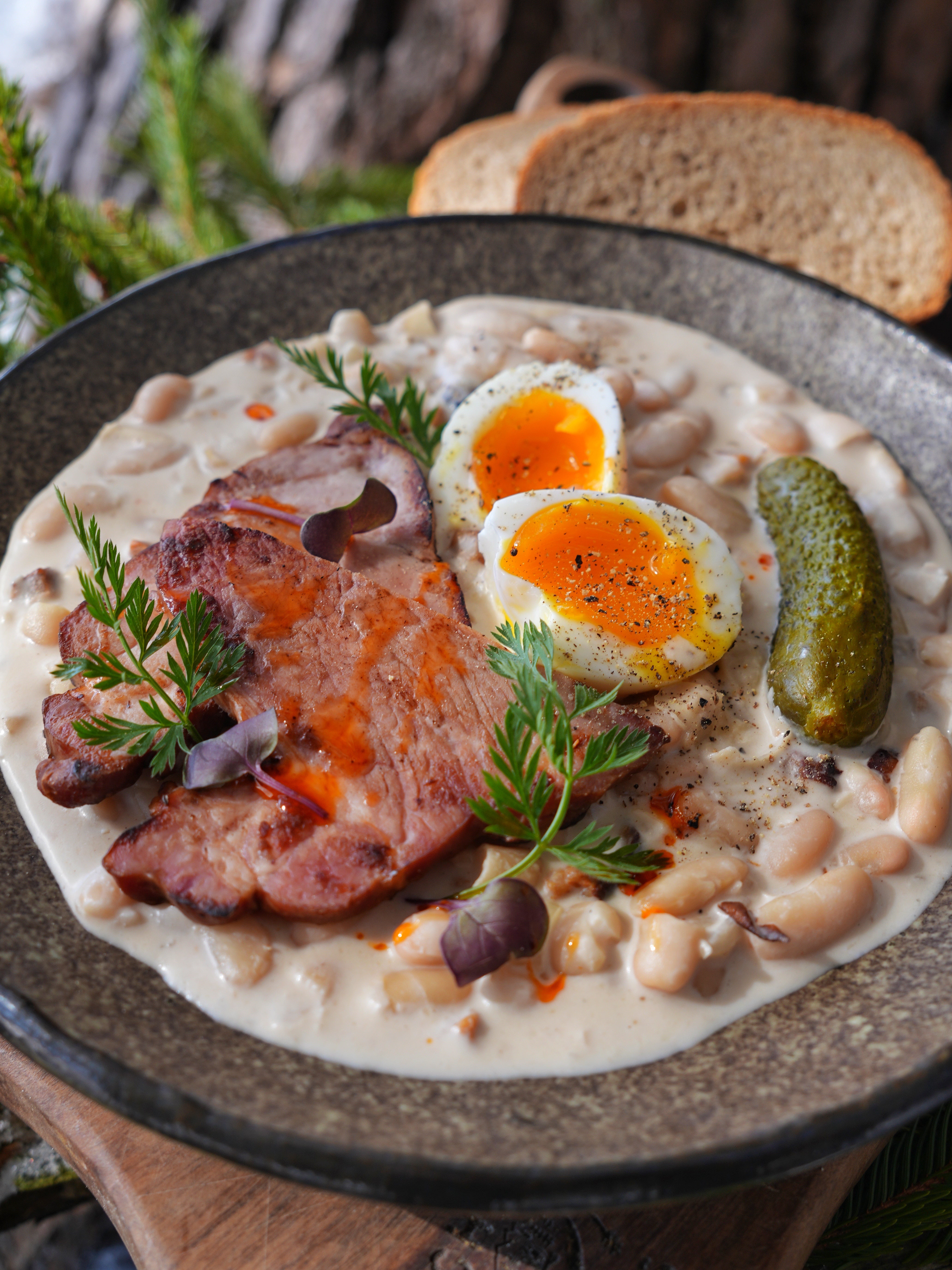 Hotový prívarok som servíroval s opečenou krkovičkou a 6 minútovým vajíčkom.