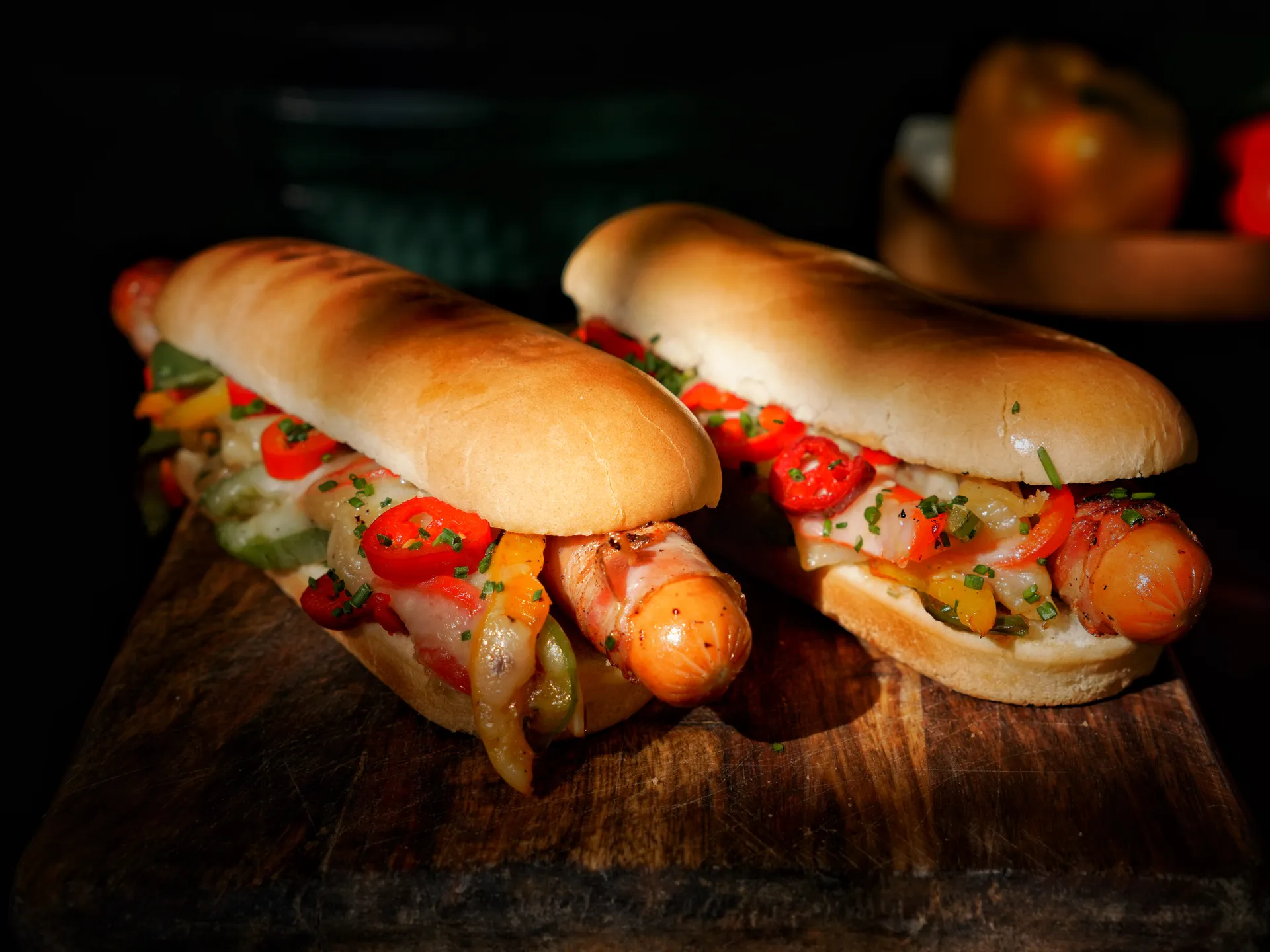 Klobásky som ugriloval tak, aby slaninka v ktorej sú obalené bola pekne chrumkavá. Medzi tým čo vajíčko @biggreenegg.sk robilo svoju prácu, nakrájal som si farebnú papriku a cibuľu na prúžky, zľahka osolil a okorenil. Keď boli klobásky hotové, zľahka som zaresoval papriky s cibuľou a zasypal ich strúhaným oštiepkom. Tak, aby sa syr pekne roztiekol. Vo finále som už len klobásky naložil do opečeného rožka, preložil orestovanými paprikami s roztečeným syrom a dozdobil nakladanými jalapenoskami a pažítkou :)