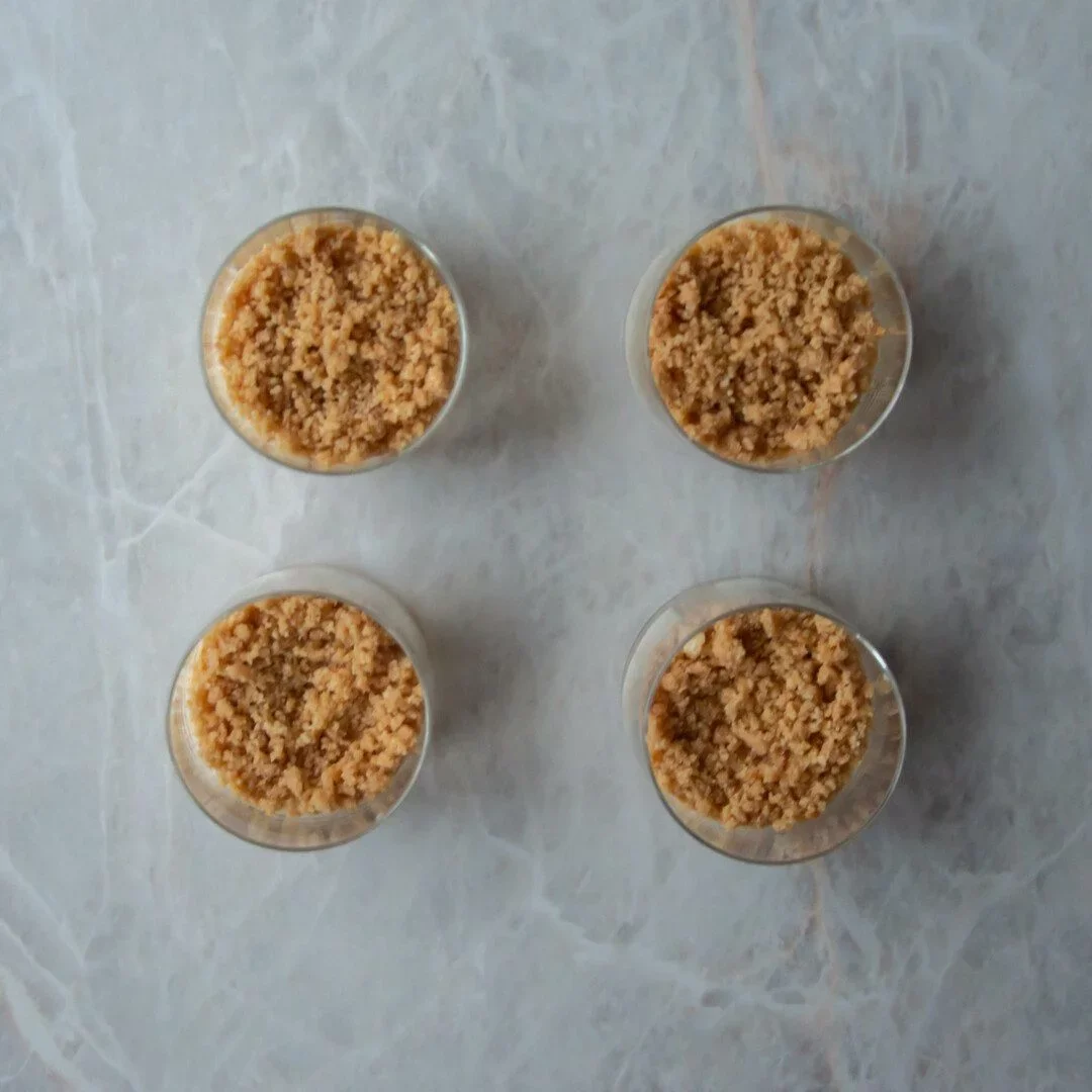 - Krok 3Následne do nádob na poháre dáme prvú vrstvu sušienok s maslom. Použijeme len polovicu zmesi, druhú si odložíme na ďalšie poschodie. Na sušienky dáme krém a znovu si polovicu odložíme.