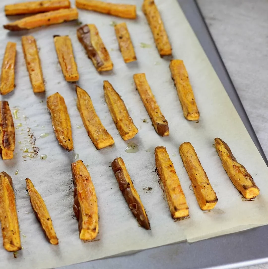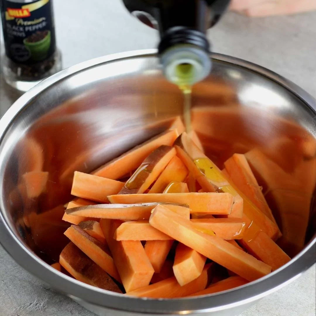 Bataty nemusíme šúpať. Ak majú peknú šupku, stačí ich vydrhnúť kefkou pod tečúcou vodou. Potom ich nakrájame na hranolky a premiešame s olivovým olejom, oreganom, soľou a korením.