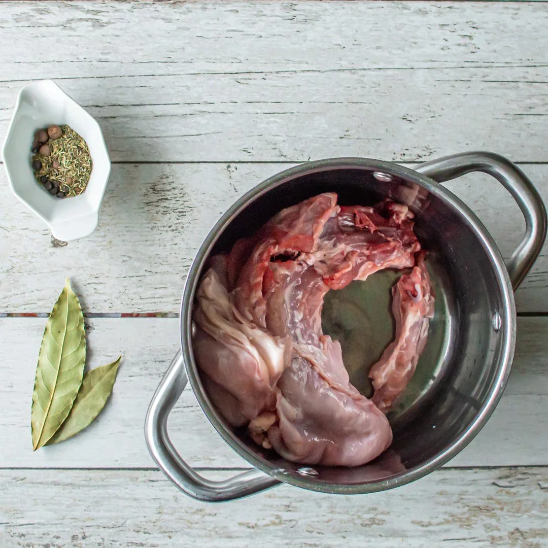 - 500 mlvývaru z trupu a krku králika, alebo iný, napríklad kurací vývar, či voda