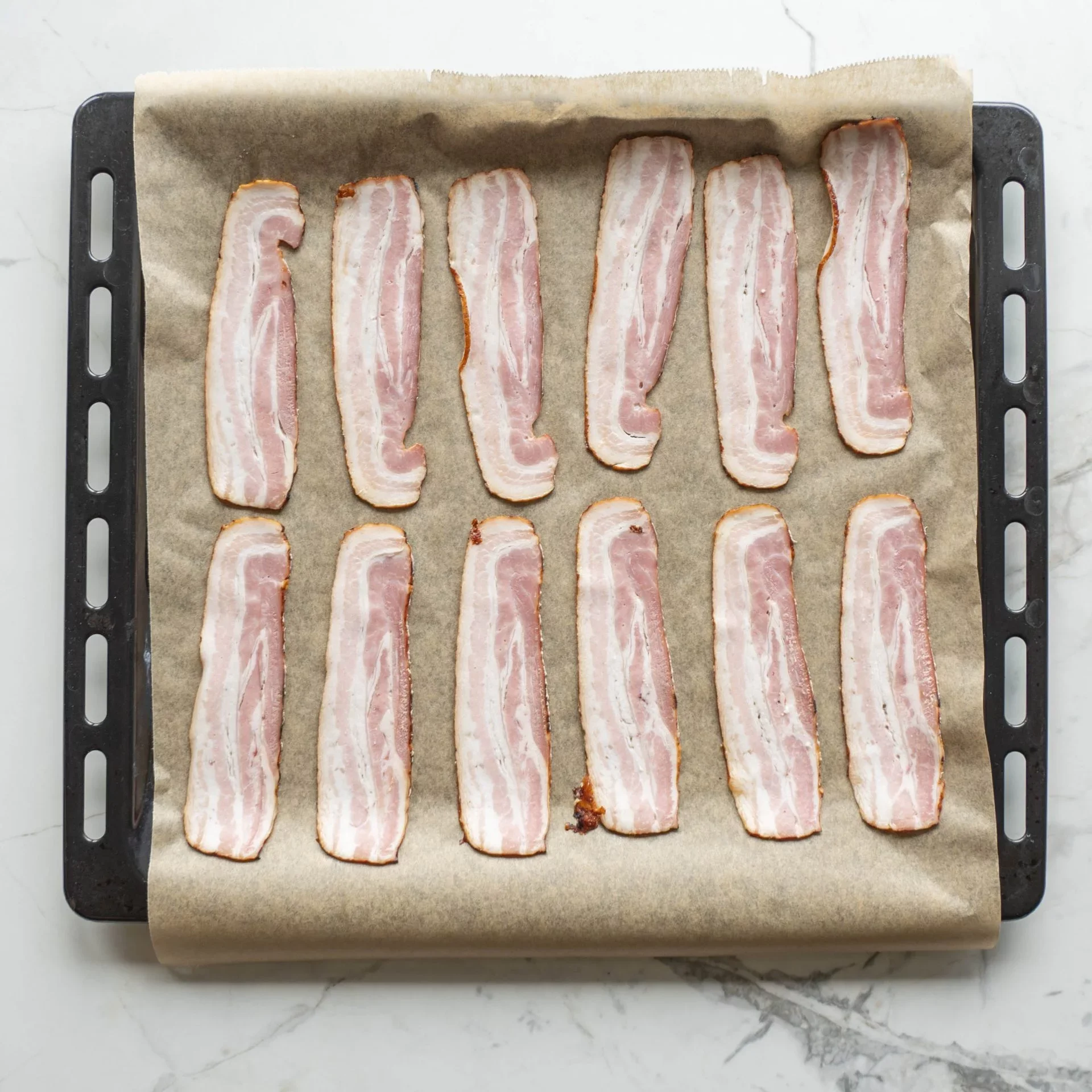 - Krok 2Počas varu sa vrhneme na prípravu dokonalých, chrumkavých slaninových čipsov z plátkov slaniny. Ja tie svoje pripravujem tak, že ich poukladám na plech vyložený papierom na pečenie a v rozohriatej rúre na 200 stupňov Celzia ich pečiem cca 10 minút dozlatista. Po upečení je dobe nechať slaninu ešte chvíľu odpočívať na kuchynskom obrúsku. Zbavíme sa tak prebytočného tuku. Ak vlastníte teplovzdušnú fritézu, v tej je efekt chrumkavosti ešte lepší.