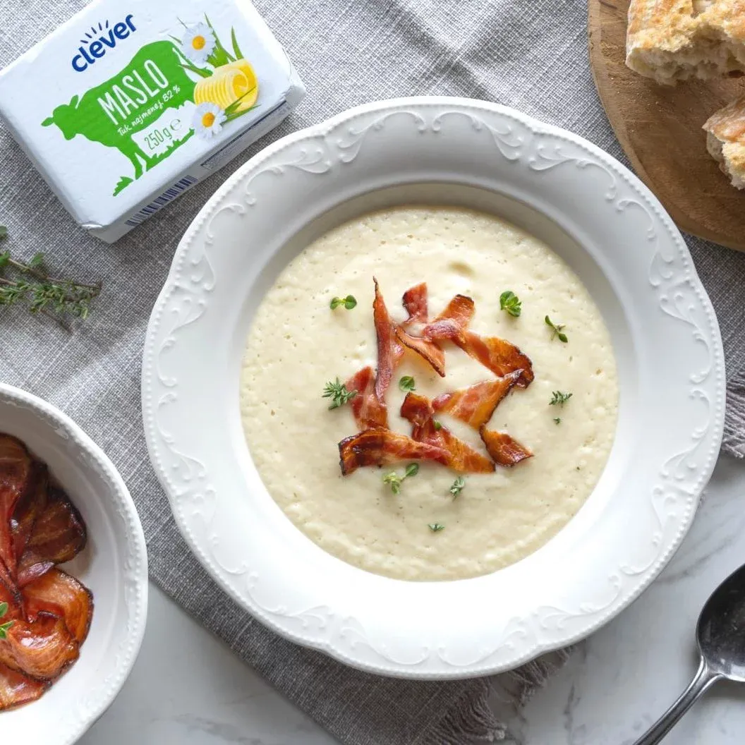 Zelerová krémová polievka a chrumkavý čips zo slaninky
