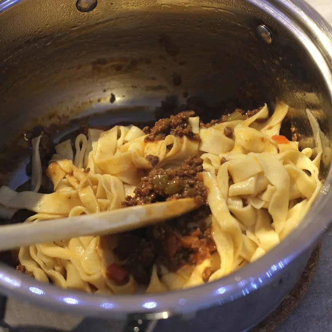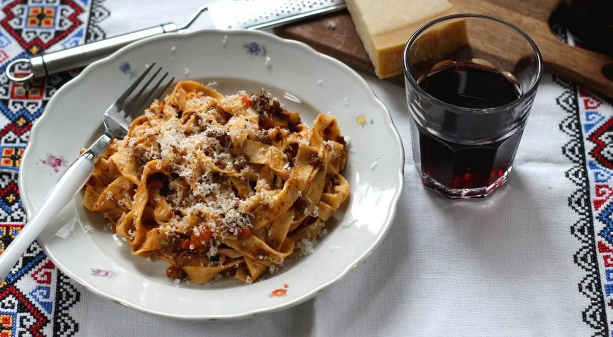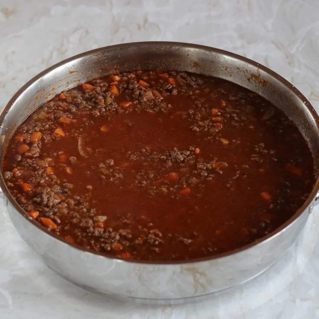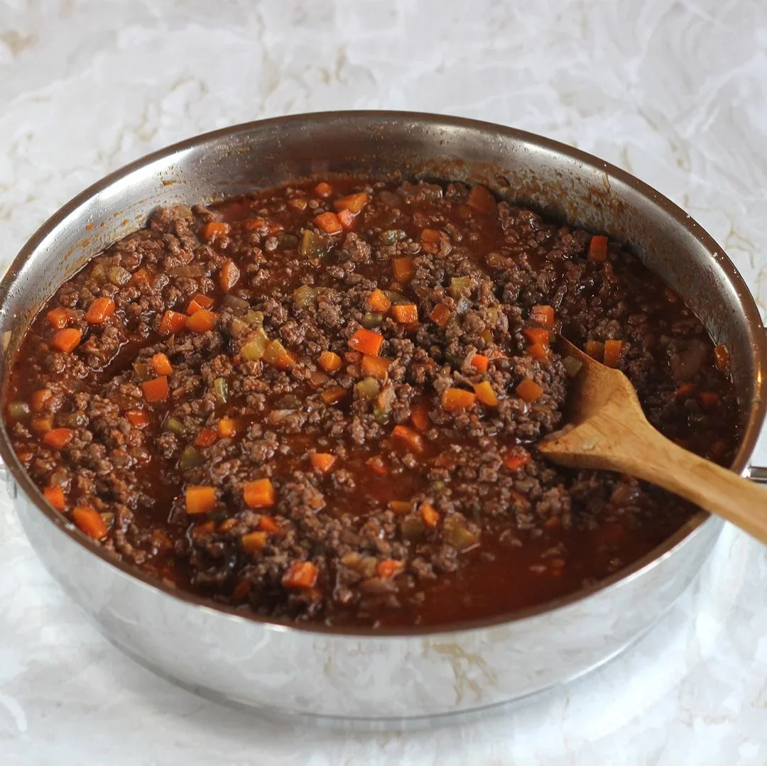Zalejeme červeným vínom a necháme pár minút bublať, aby sa vyparil alkohol a časť tekutiny. Potom pridáme bobkový list, osolíme, okoreníme a primiešame paradajkový pretlak – použijeme kvalitný – koncentrovaný. Dolejeme podľa potreby vývarom, teplotu stiahneme na minimum, zakryjeme a takto dusíme pomaly 2 až 3 hodiny. Občas skontrolujeme, premiešame, prípadne dolejeme vývar. Čas varenia netreba podceňovať, pretože len dôkladným a pomalým varením dosiahneme lahodné a chuťovo silné ragú.