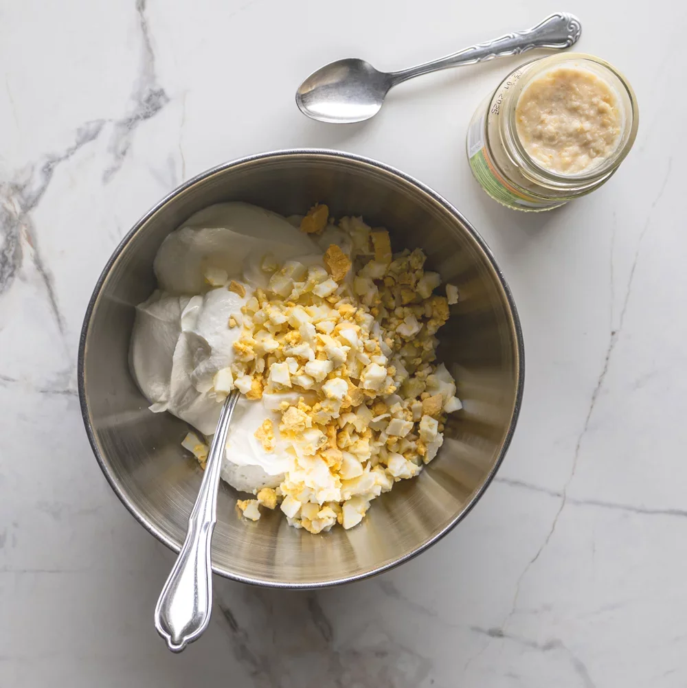 Na drobno nakrájané vajíčka zmiešame s tatárskou omáčkou, kyslou smotanou a chrenom. Všetko dobre premiešame a ochutnáme. Podľa chuti ešte príp. dosolíme.