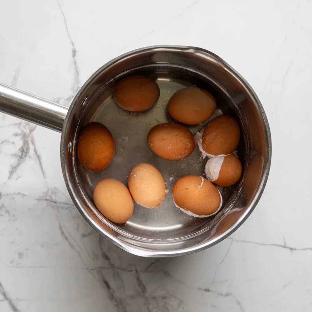 Vajíčka uvaríme natvrdo, teda 15 minút od varu momentu varu. Potom ich schladíme studenou vodou a necháme v nej vychladnúť. Následne opatrne olúpeme zo škrupiny.