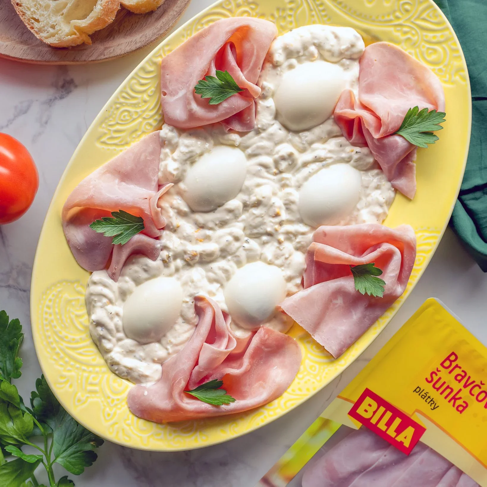 Okolo naaranžujeme šunku a navrch doladíme lístočkami petržlenovej vňate. Podávame s čerstvým pečivom. Dobrú chuť a veselú Veľkú noc!