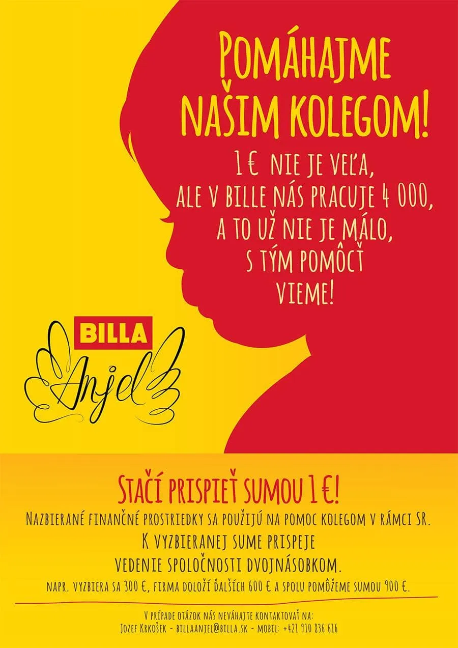Občianske združenie BILLA ľuďom myslí aj na tých zamestnancov našej spoločnosti, ktorí sa ocitnú v núdzi. Projekt BILLA Anjel je zameraný na pomoc spolupracovníkom, ktorí sa ocitli v neľahkej životnej situácii. Pomoc je o to cennejšia, že ide priamo od kolegov ku kolegom a je podporená spoločnosťou, v ktorej pracujú. V roku 2019 sme takto interne pomohli 10 kolegom sumou 15.771,86 eur, ktoré sa vyzbierali z predajní a následne príspevok z občianskeho združenia tvoril čiastku 36.043,72 € , teda celková čiastka pomoci tvorila sumu 51 815,58 €. Pomohli sme im zabezpečiť kúpeľnú liečbu, lieky a výživové doplnky, zdravotné pomôcky , rehabilitačné pomôcky na zlepšenie zdravotného stavu.