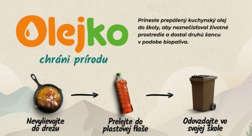 Rodičia a deti zapojené do projektu OLEJKO CHRÁNI PRÍRODU nosia použitý kuchynský olej a tuky jednoducho ráno do škôlky či školy. Zlozvyk domácností vylievať tento druh odpadu do umývadla, toalety, prírody či vyhadzovať do komunálneho odpadu totiž predstavuje značné riziko pre vodu a pôdu.