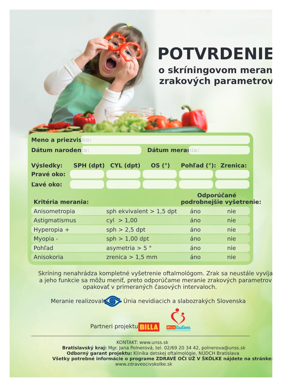Po meraní dostalo každé dieťa certifikát pre rodiča, kde sa ten dozvie, či boli zmerané parametre v poriadku. V treťom ročníku sme certifikát navyše obohatili o informácie pre deti aj rodičov o potravinách vhodných pre zrak. Takto sa aj škôlkar podľa obrázkov dozvedel, že napríklad brokolica alebo čučoriedka urobí jeho očiam dobre.